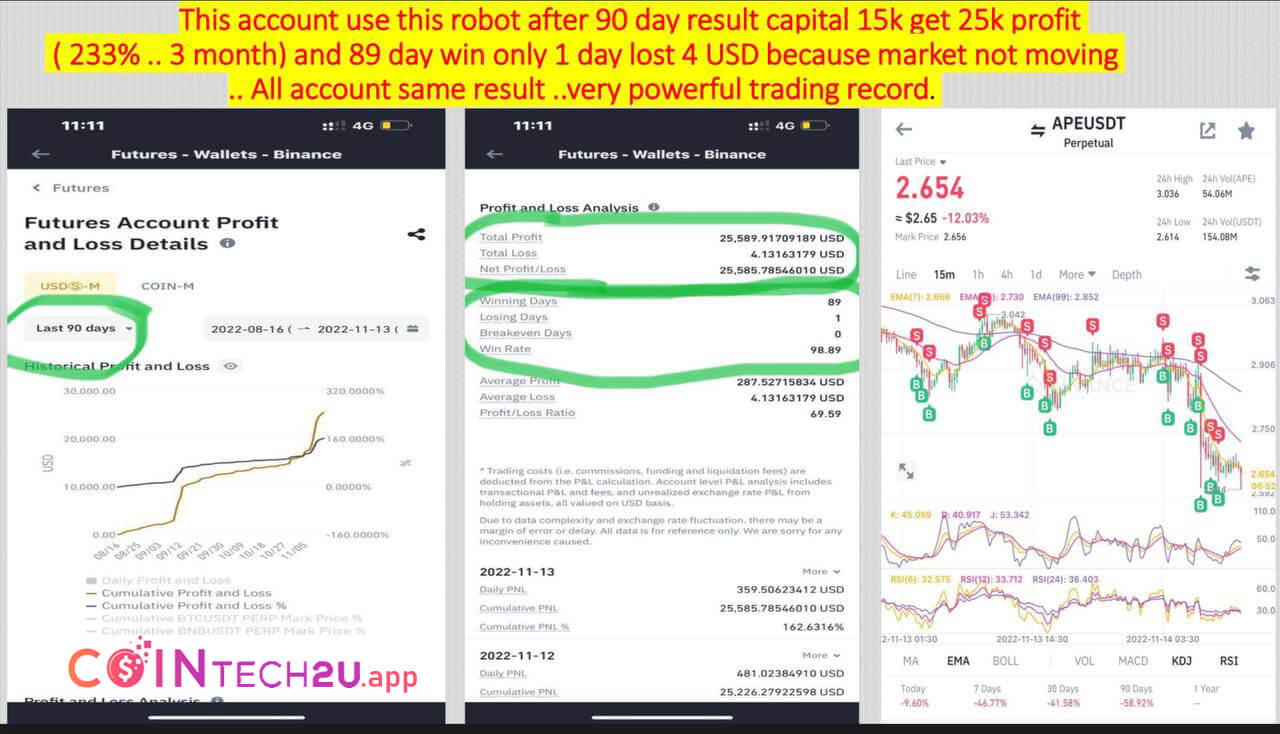 Akun ini menggunakan robot Cointech2U dengan modal awal $15,000 dan setelah 90 hari mendapatkan profit $25,000 atau 233% dalam 3 bulan..!!!